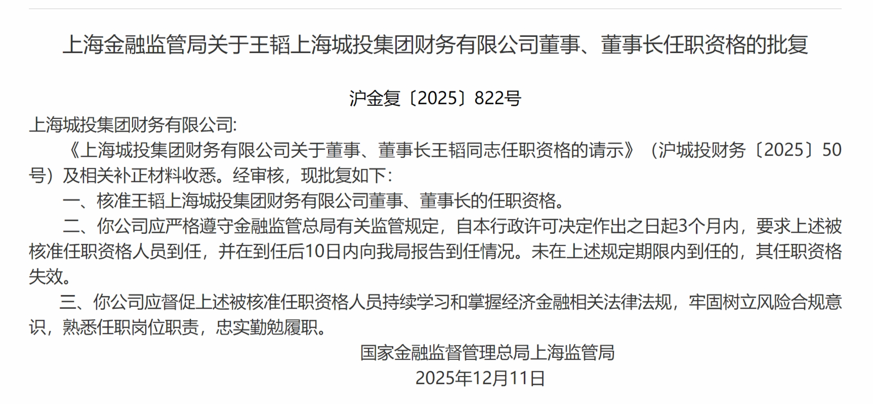 12月23日立盟策略,上海金融监管局发布关于王韬上海城投集团财务有限公司董事、董事长任职资格的批复,核准王韬上海城投集团财务有限公司董事、董事长的任职资格。