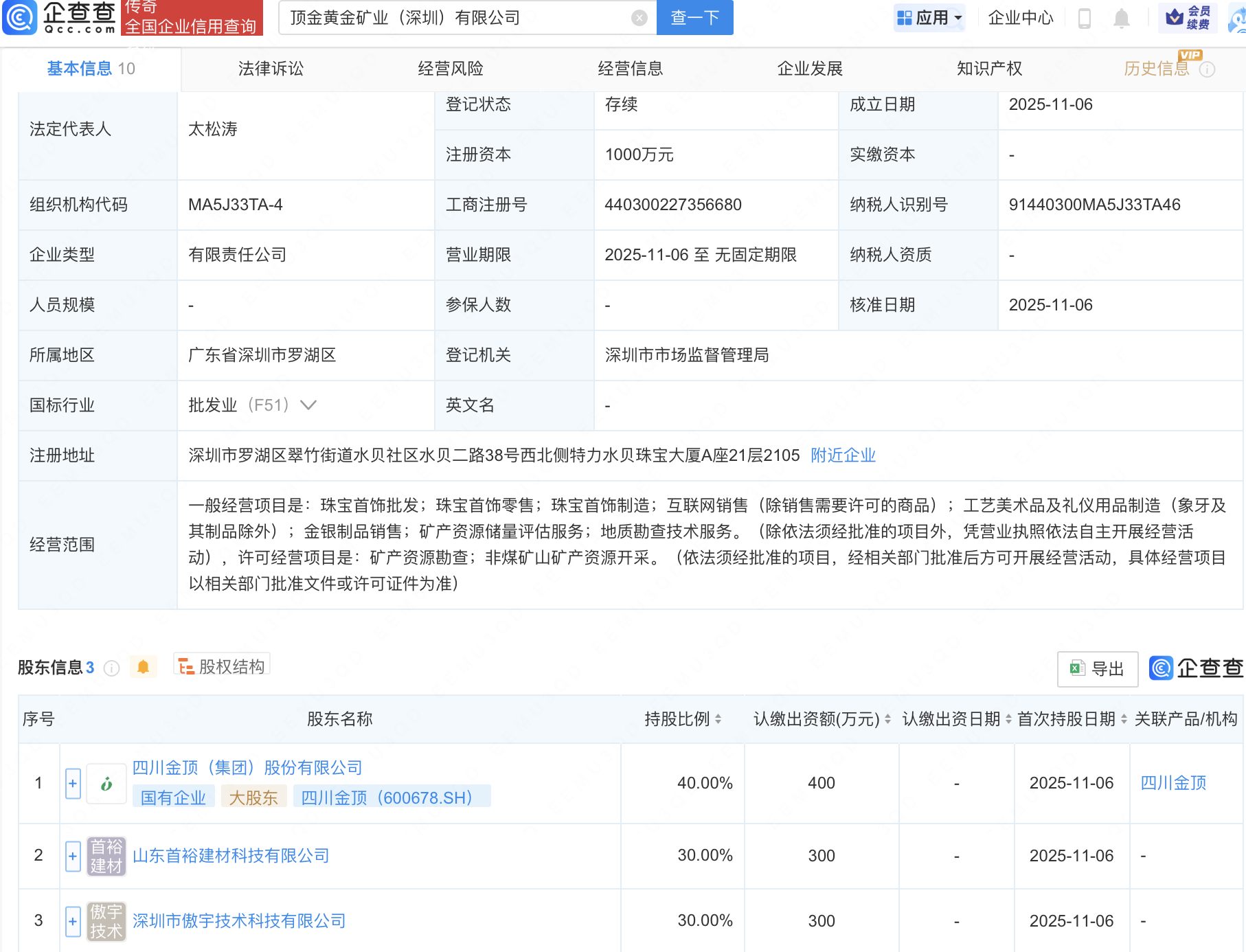 近日易投投,顶金黄金矿业(深圳)有限公司成立,注册资本1000万元,经营范围包含:矿产资源储量评估服务;地质勘查技术服务;矿产资源勘查;非煤矿山矿产资源开采等。企查查股权穿透显示,该公司由四川金顶(600678)等共同持股。
